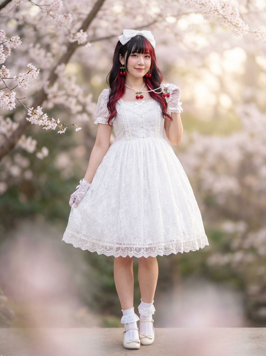 model in coquette fashion, white lace dress, dainty bow accessories, cherry motifs, soft dreamy lighting