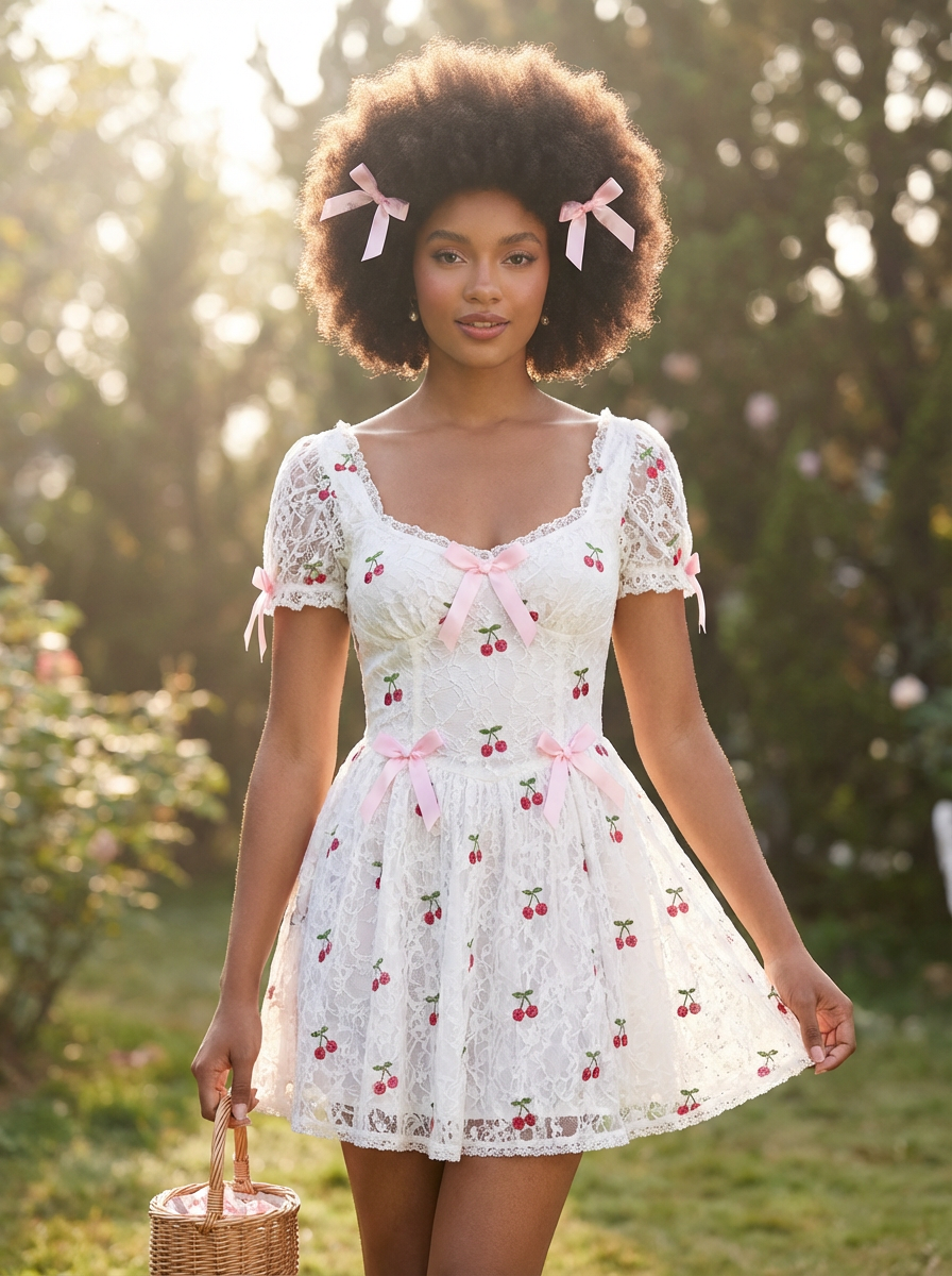model in coquette fashion, white lace dress, dainty bow accessories, cherry motifs, soft dreamy lighting