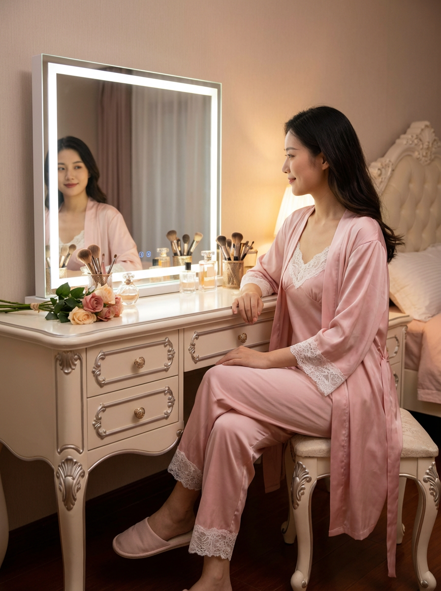 model in coquette loungewear, silk pajamas with lace trim, soft pink tones, vanity mirror setting