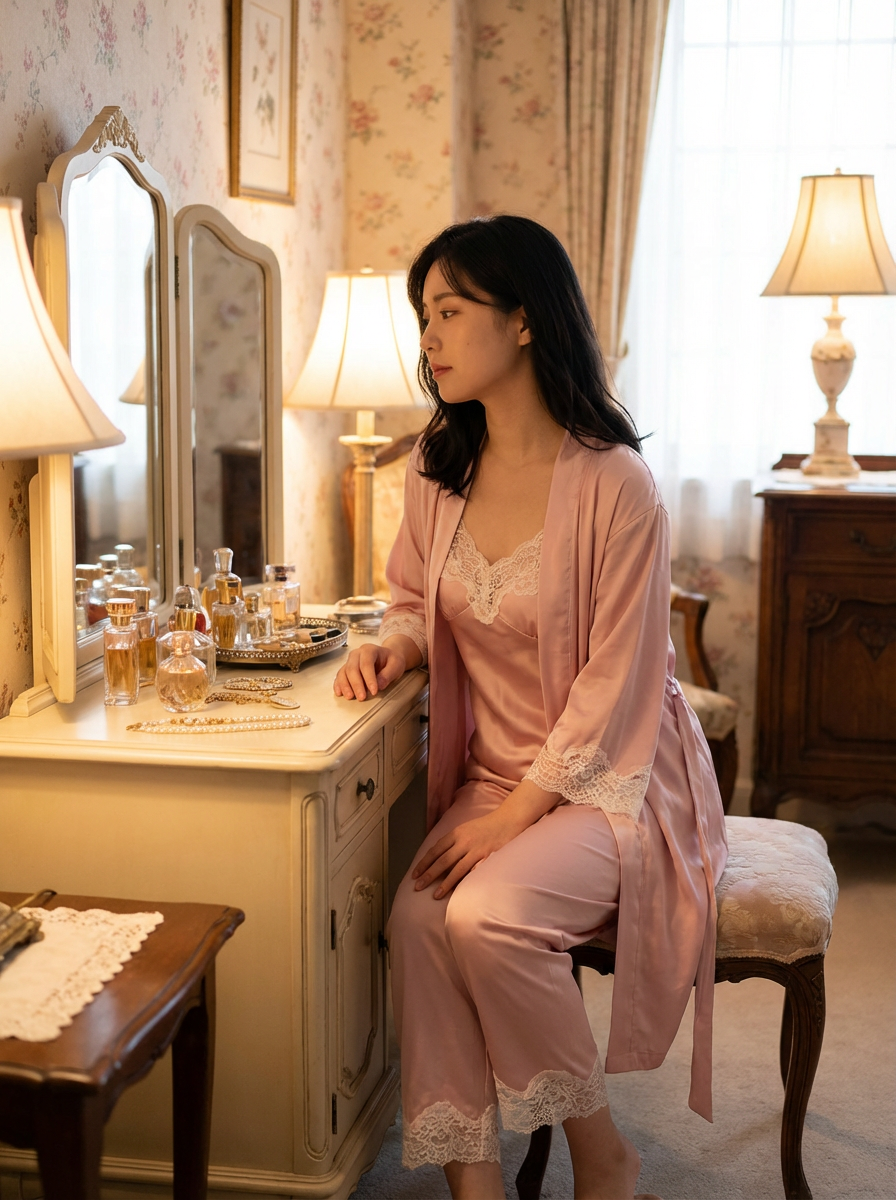 model in coquette loungewear, silk pajamas with lace trim, soft pink tones, vanity mirror setting