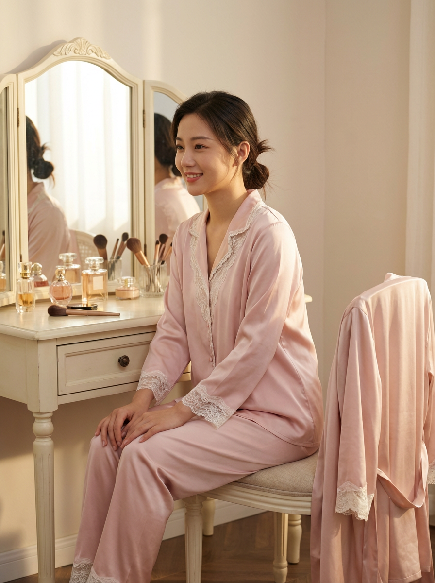 model in coquette loungewear, silk pajamas with lace trim, soft pink tones, vanity mirror setting