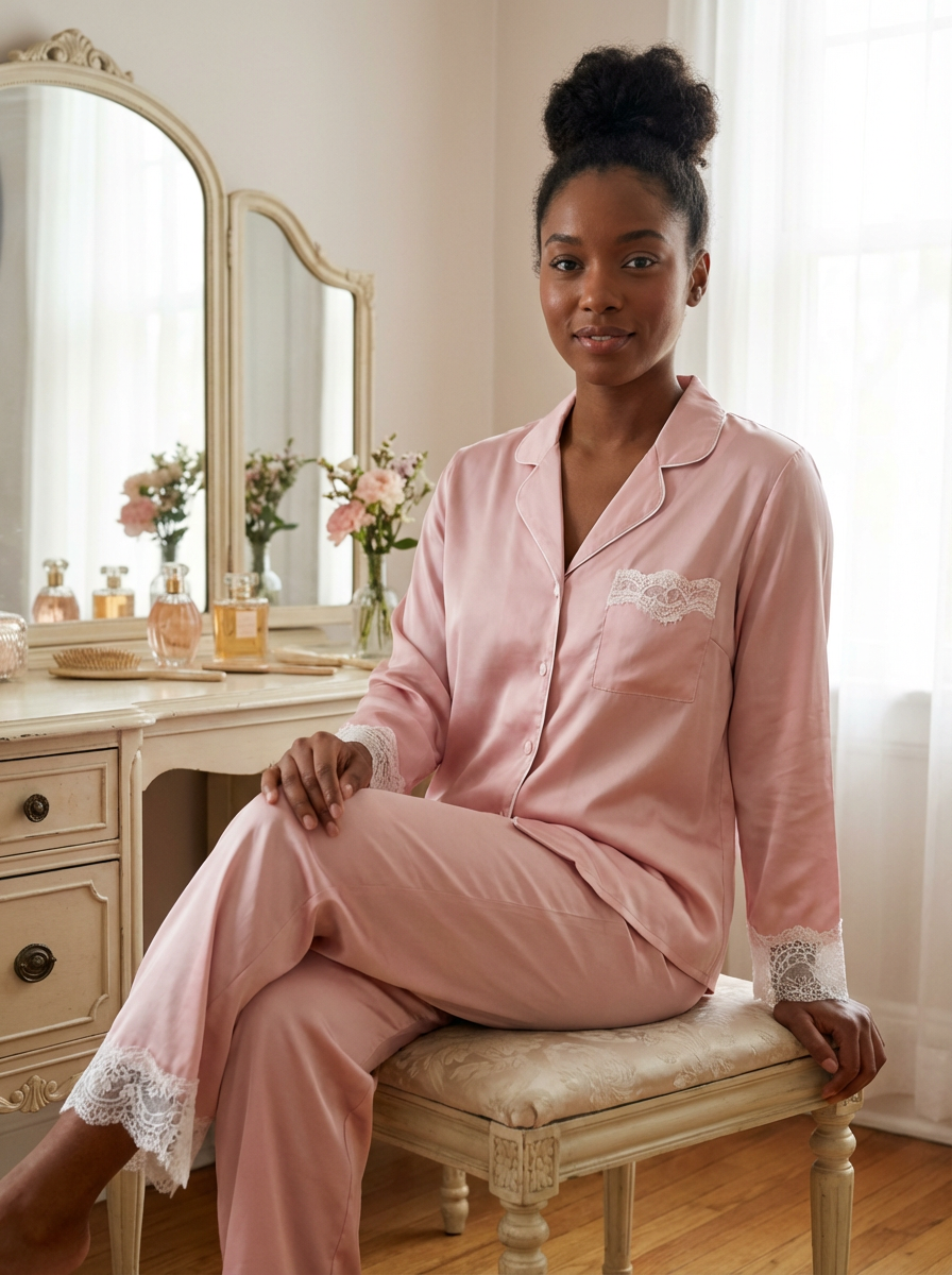 model in coquette loungewear, silk pajamas with lace trim, soft pink tones, vanity mirror setting