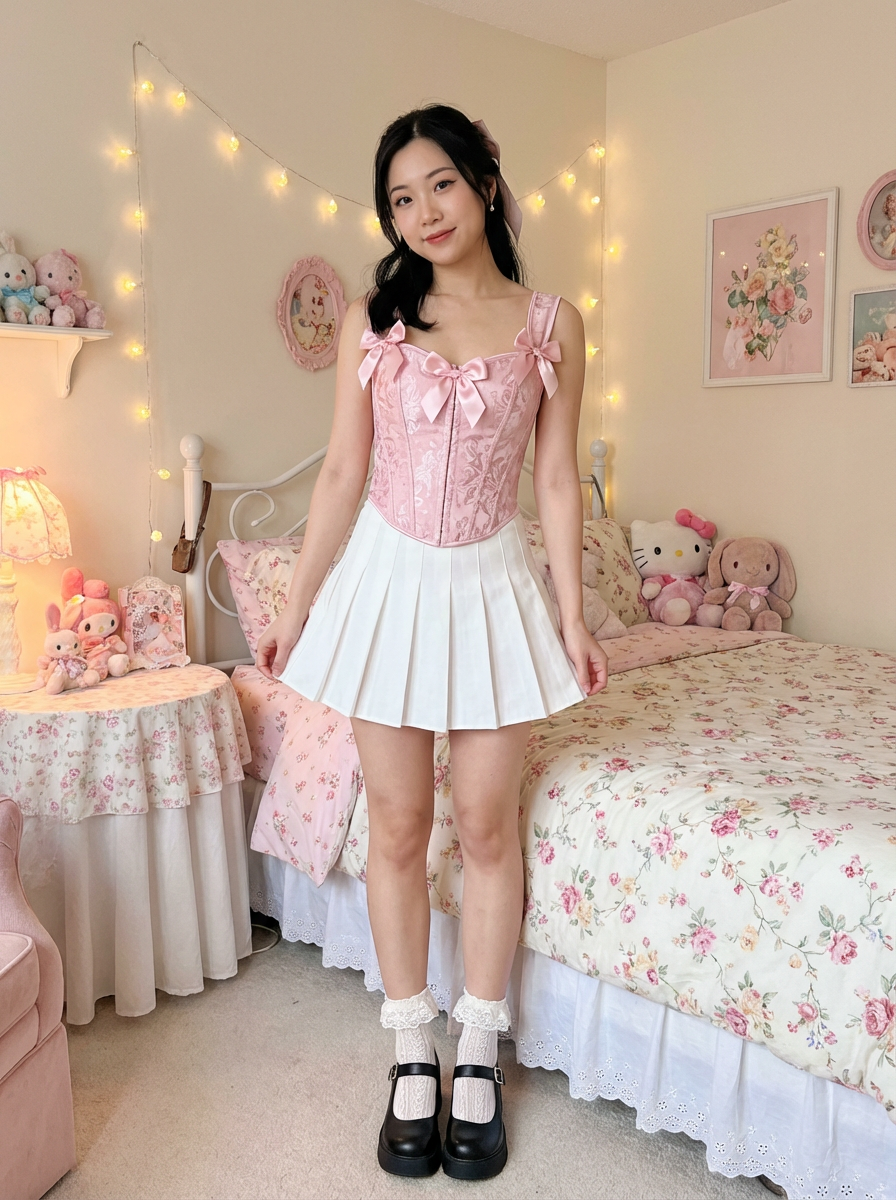 model in coquette outfit, corset top with bows, pleated mini skirt, Mary Jane shoes, girly room decor