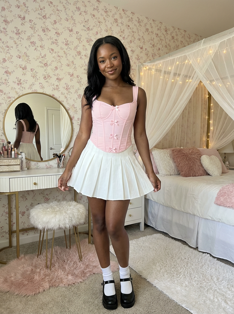 model in coquette outfit, corset top with bows, pleated mini skirt, Mary Jane shoes, girly room decor