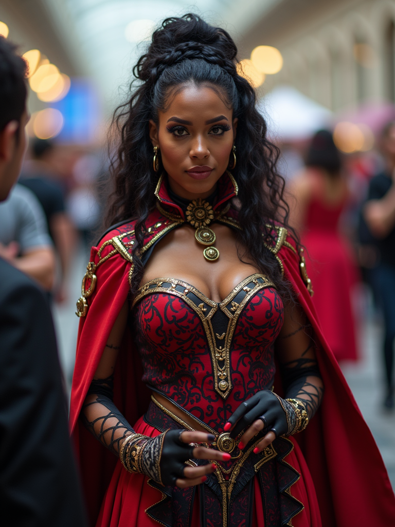 model in cosplay group photo, wearing a villainous empress outfit with intricate details , interacting with other cosplayers, vibrant and fun atmosphere