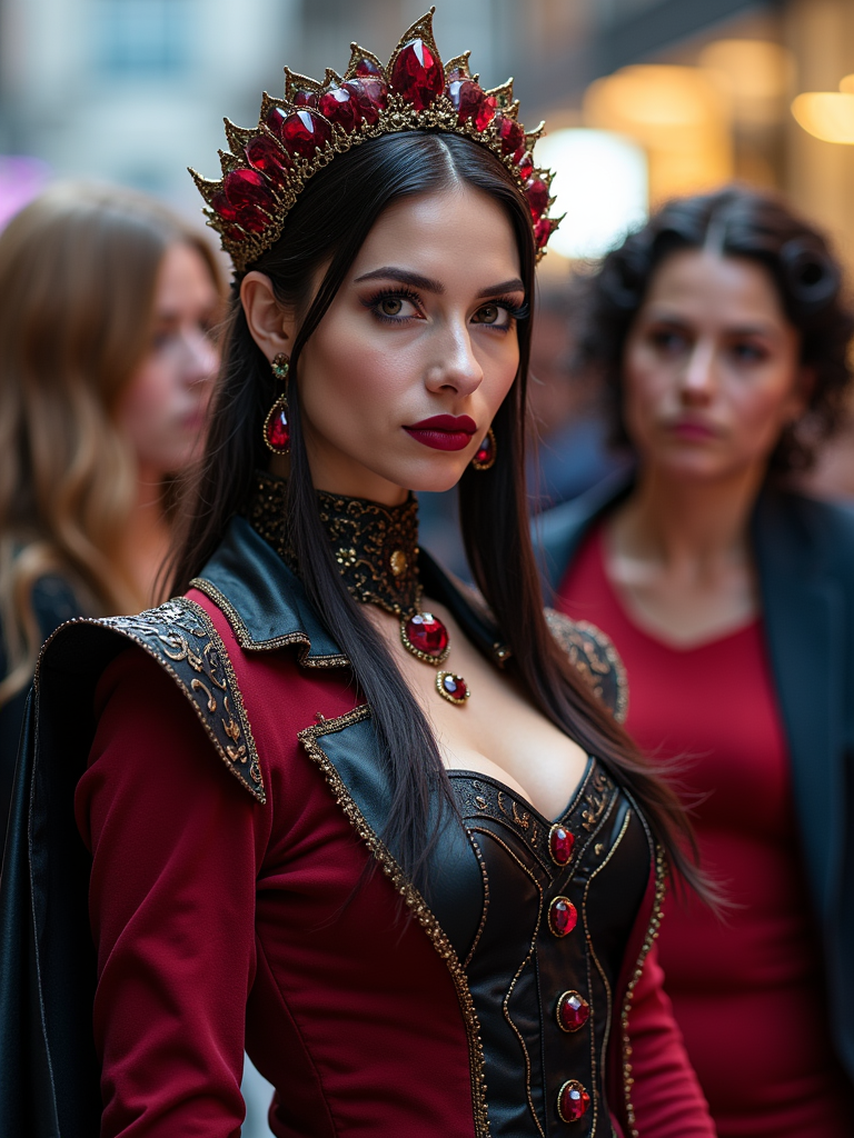 model in cosplay group photo, wearing a villainous empress outfit with intricate details , interacting with other cosplayers, vibrant and fun atmosphere