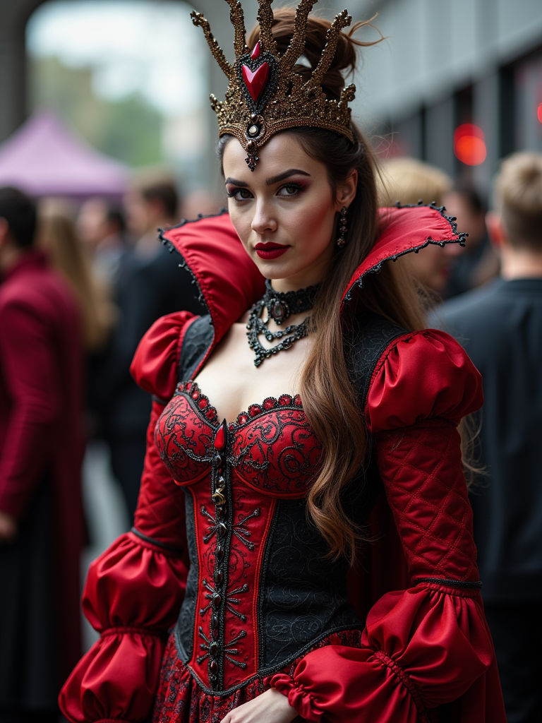 model in cosplay group photo, wearing a villainous empress outfit with intricate details , interacting with other cosplayers, vibrant and fun atmosphere