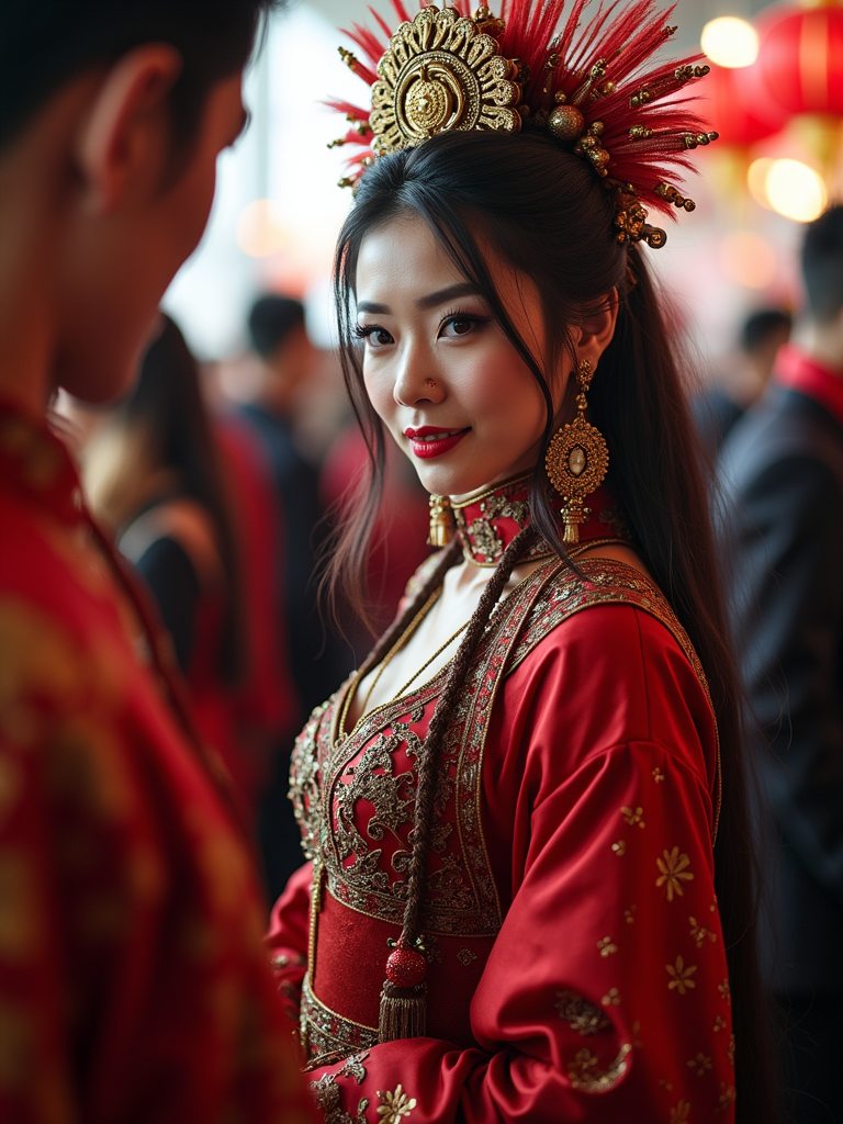 model in cosplay group photo, wearing a villainous empress outfit with intricate details , interacting with other cosplayers, vibrant and fun atmosphere