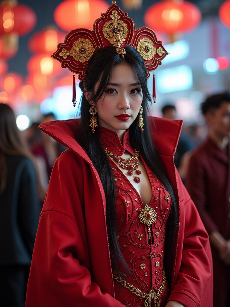 model in cosplay group photo, wearing a villainous empress outfit with intricate details , interacting with other cosplayers, vibrant and fun atmosphere