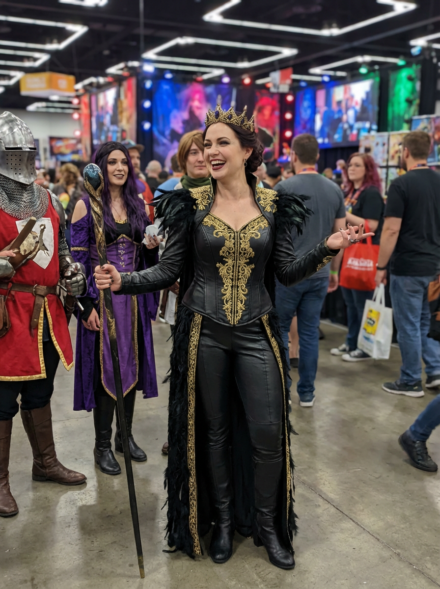 model in cosplay group photo, wearing a villainous empress outfit with intricate details , interacting with other cosplayers, vibrant and fun atmosphere