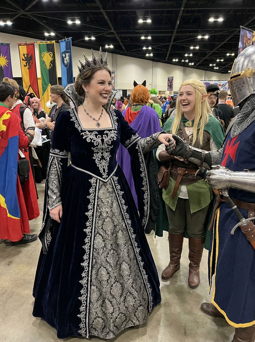 model in cosplay group photo, wearing a villainous empress outfit with intricate details , interacting with other cosplayers, vibrant and fun atmosphere
