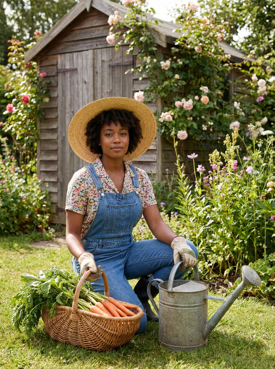 model in cottage garden, straw hat, gathering vegetables, vintage watering can, quaint garden shed background
