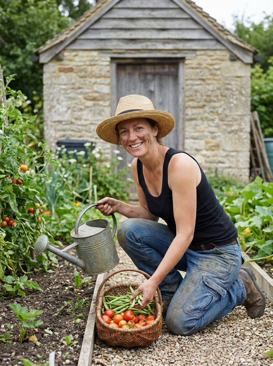 model in cottage garden, straw hat, gathering vegetables, vintage watering can, quaint garden shed background