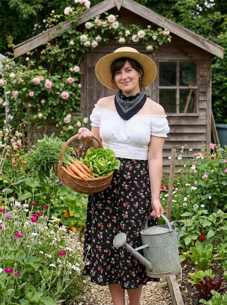 model in cottage garden, straw hat, gathering vegetables, vintage watering can, quaint garden shed background