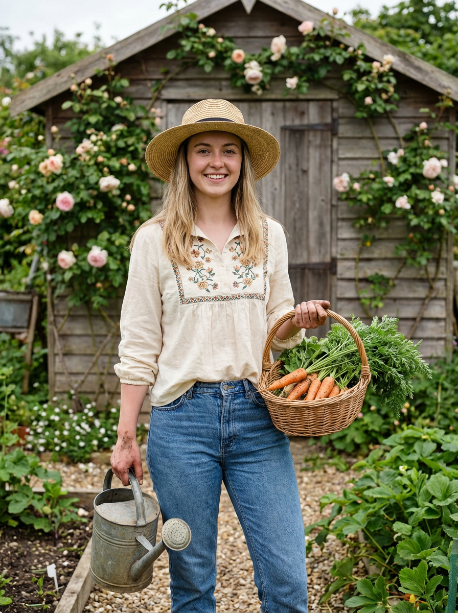 model in cottage garden, straw hat, gathering vegetables, vintage watering can, quaint garden shed background
