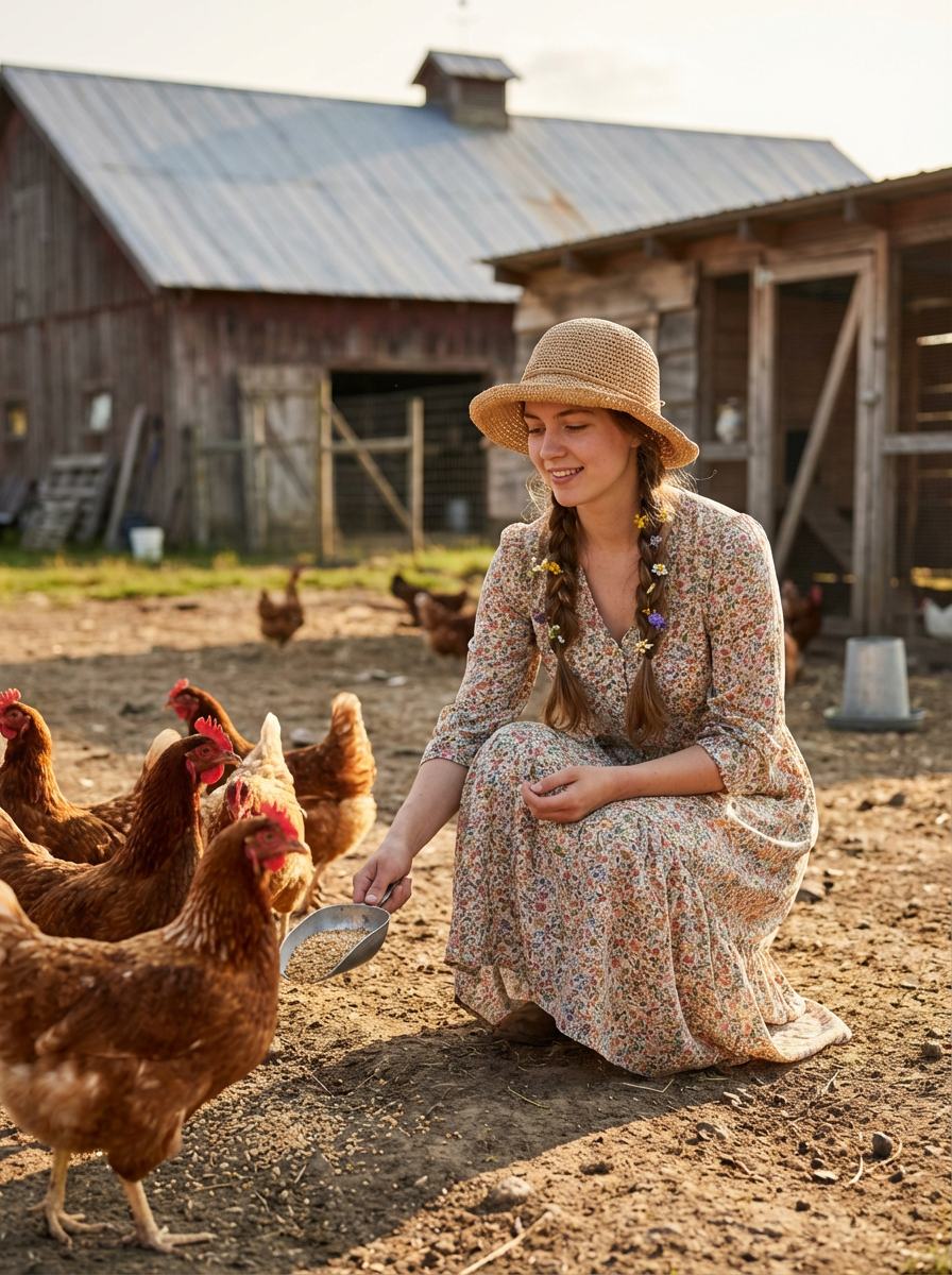model in cottagecore fashion, prairie dress, braided hair with flowers, feeding chickens, farm setting