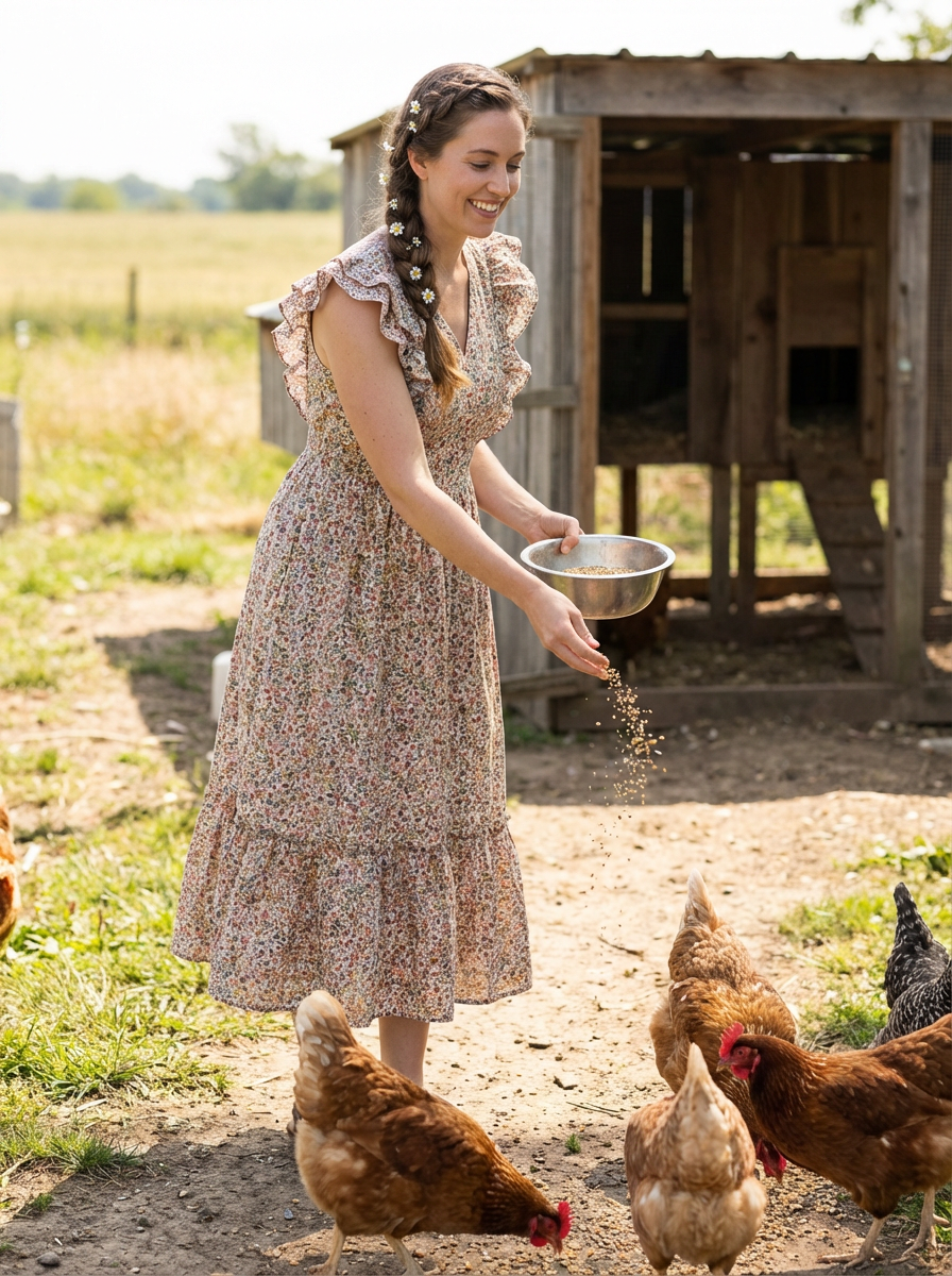 model in cottagecore fashion, prairie dress, braided hair with flowers, feeding chickens, farm setting