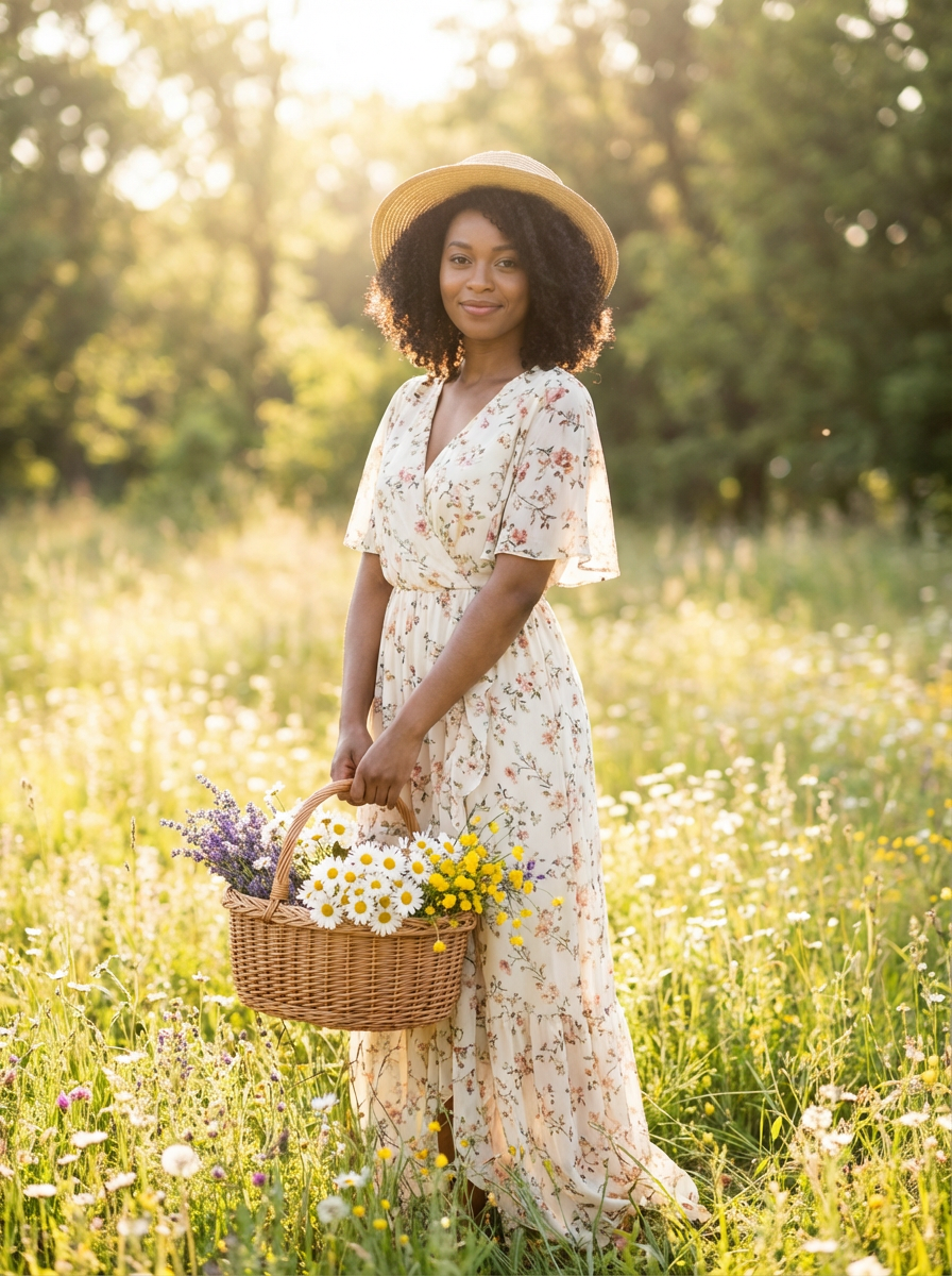 model in cottagecore outfit, flowy floral dress, wicker basket of wildflowers, sunny meadow setting, soft romantic lighting