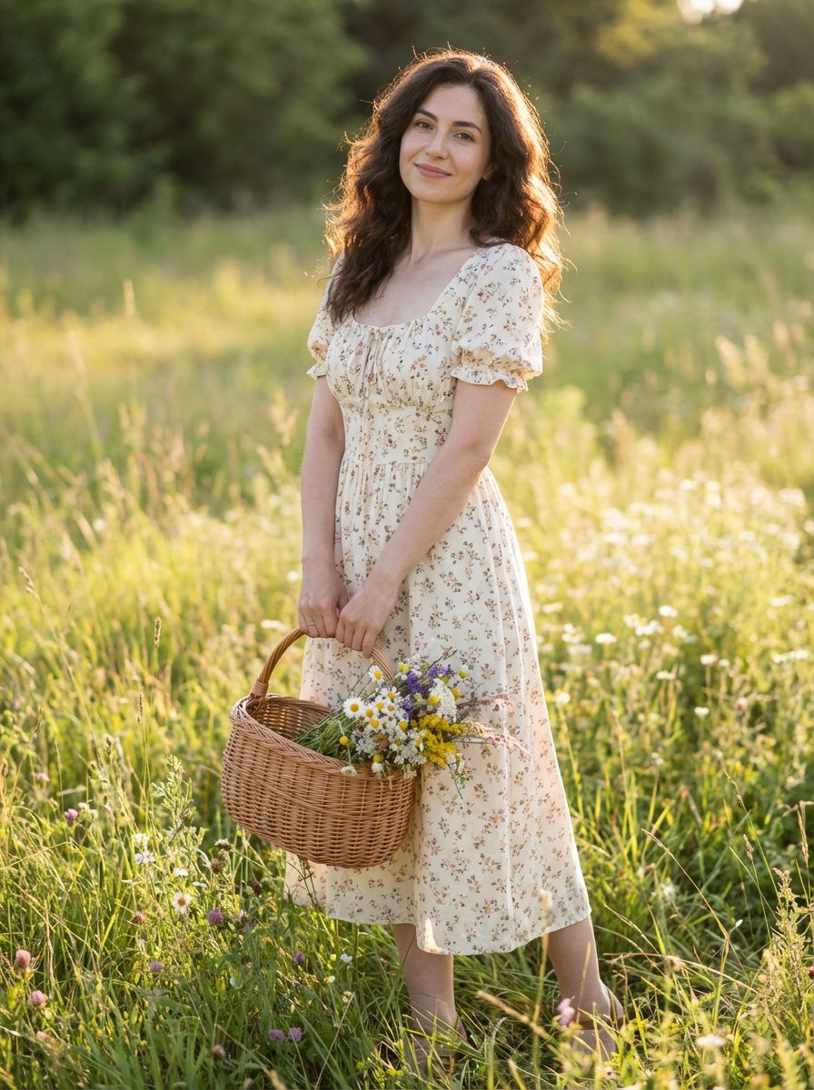 model in cottagecore outfit, flowy floral dress, wicker basket of wildflowers, sunny meadow setting, soft romantic lighting