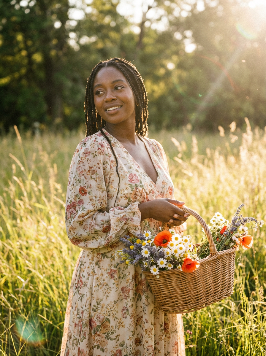 model in cottagecore outfit, flowy floral dress, wicker basket of wildflowers, sunny meadow setting, soft romantic lighting