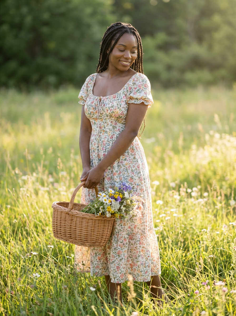 model in cottagecore outfit, flowy floral dress, wicker basket of wildflowers, sunny meadow setting, soft romantic lighting