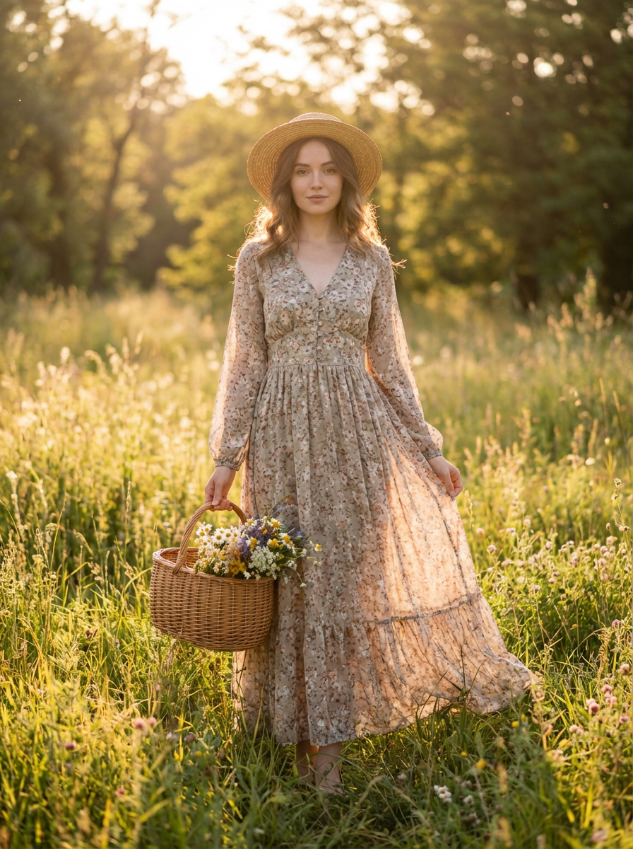 model in cottagecore outfit, flowy floral dress, wicker basket of wildflowers, sunny meadow setting, soft romantic lighting