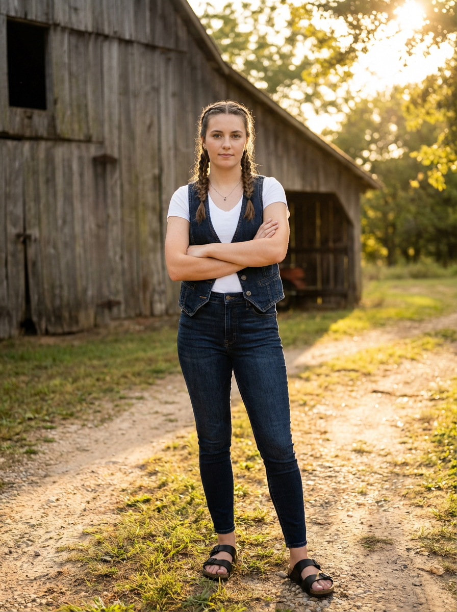 model in country album cover setting, authentic rural backdrop, genuine expression, storytelling mood