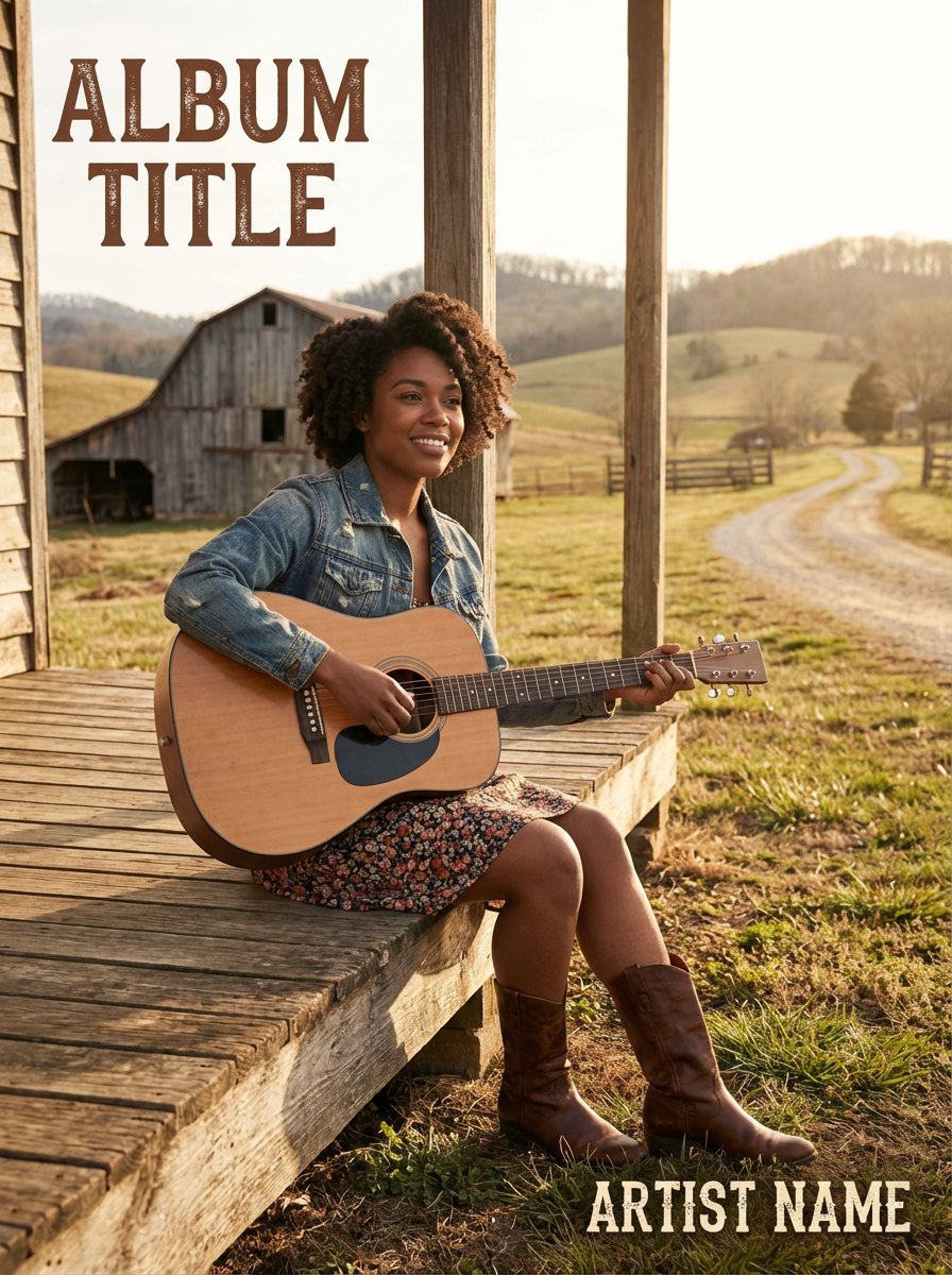 model in country album cover setting, authentic rural backdrop, genuine expression, storytelling mood