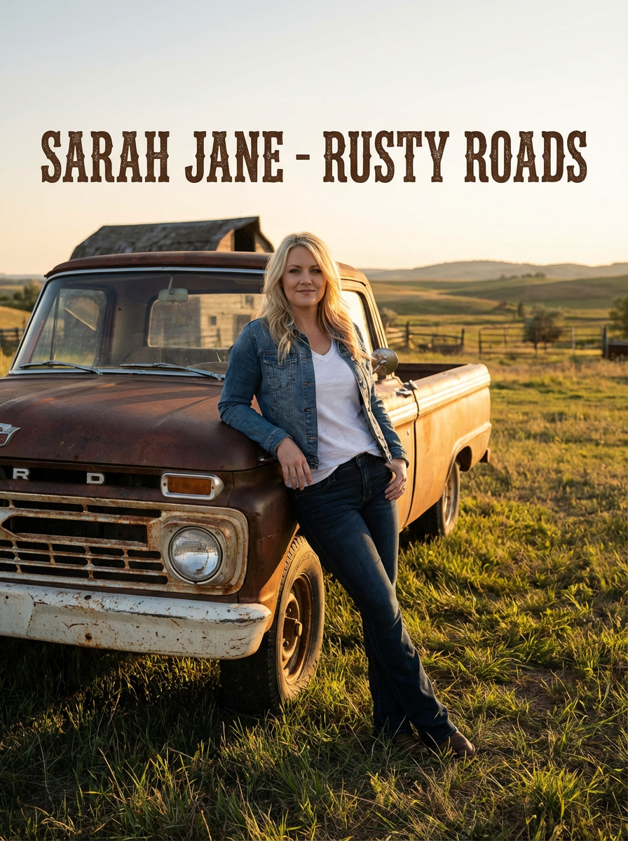 model in country album cover setting, authentic rural backdrop, genuine expression, storytelling mood