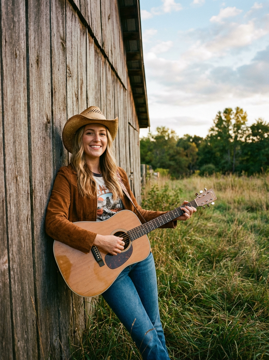 model in country album cover setting, authentic rural backdrop, genuine expression, storytelling mood