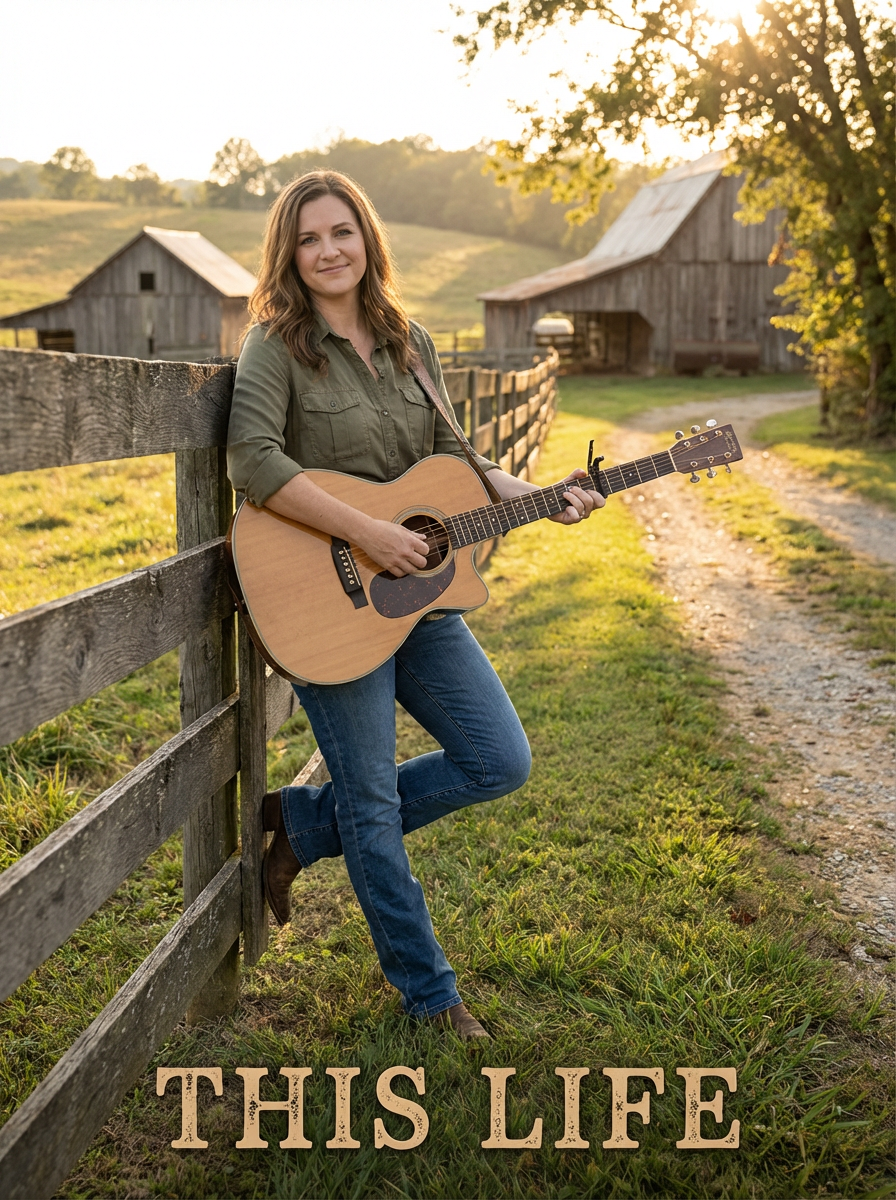 model in country album cover setting, authentic rural backdrop, genuine expression, storytelling mood