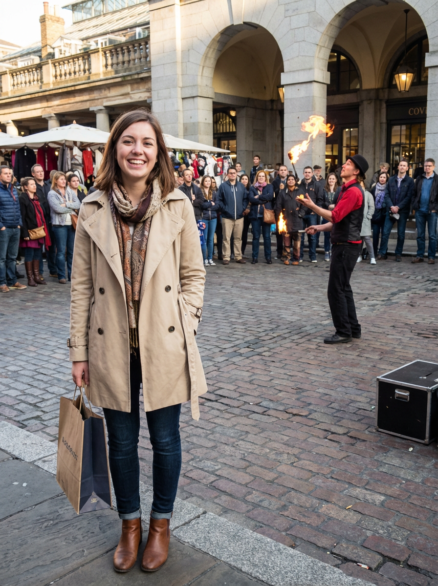 model in Covent Garden, street performer background, stylish shopping outfit, lively atmosphere