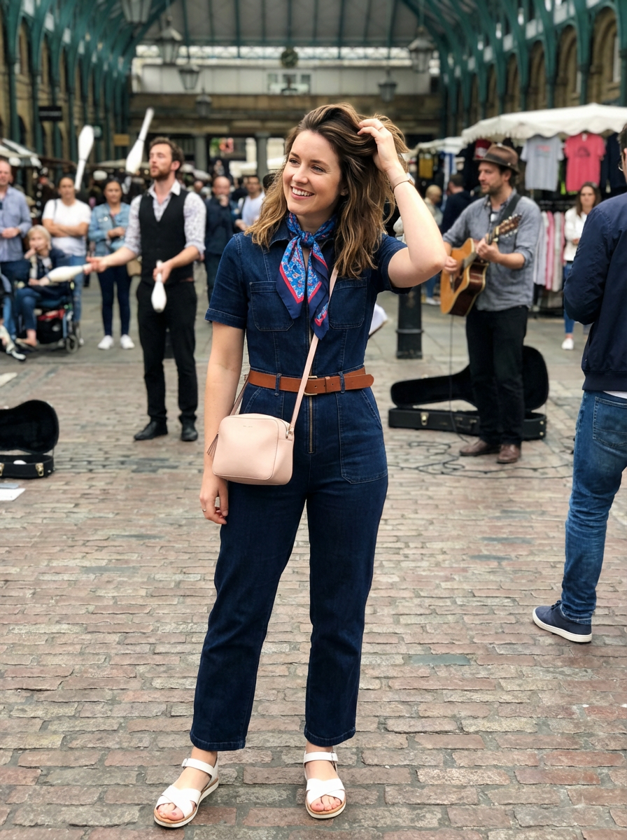 model in Covent Garden, street performer background, stylish shopping outfit, lively atmosphere