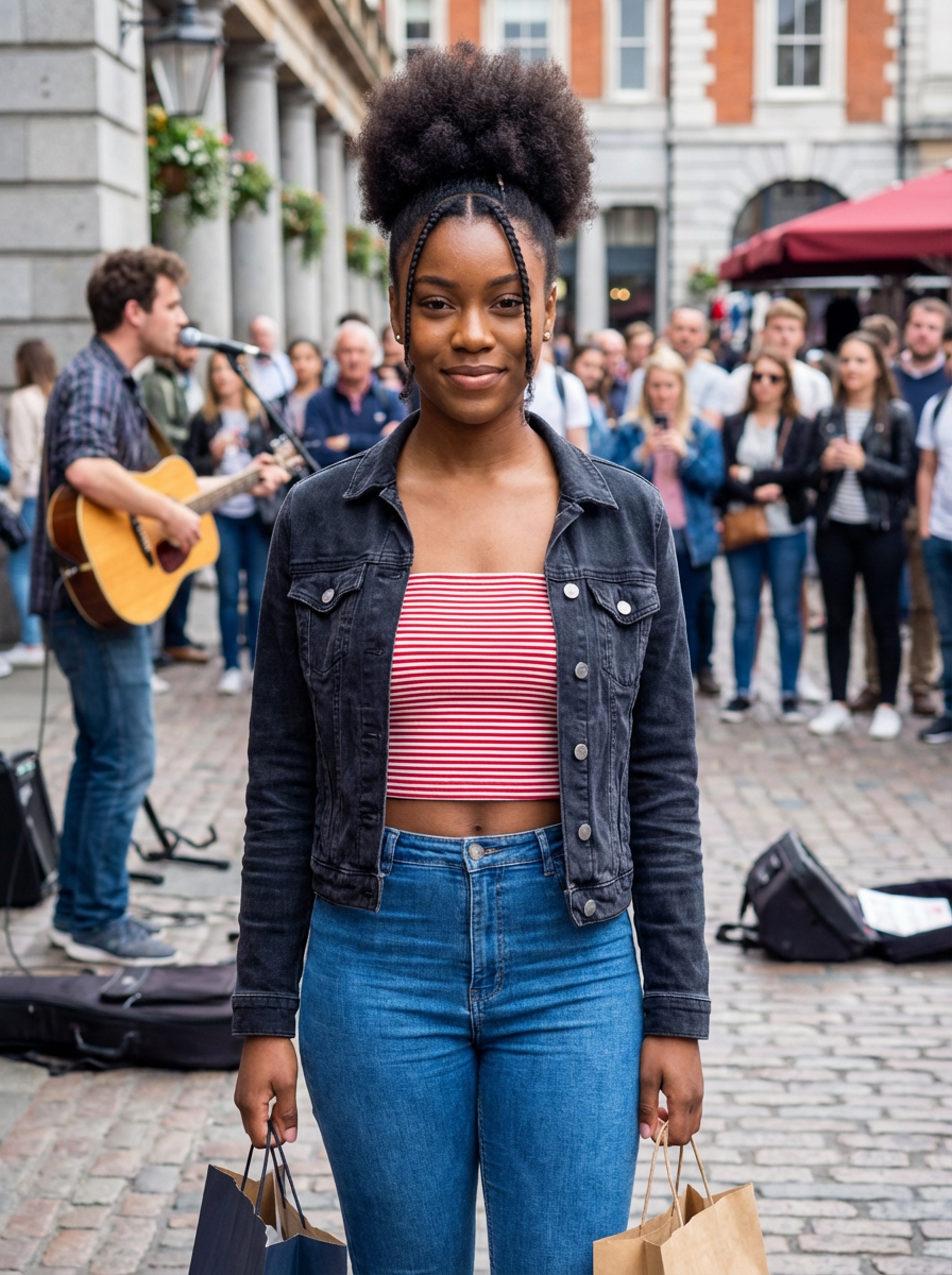 model in Covent Garden, street performer background, stylish shopping outfit, lively atmosphere