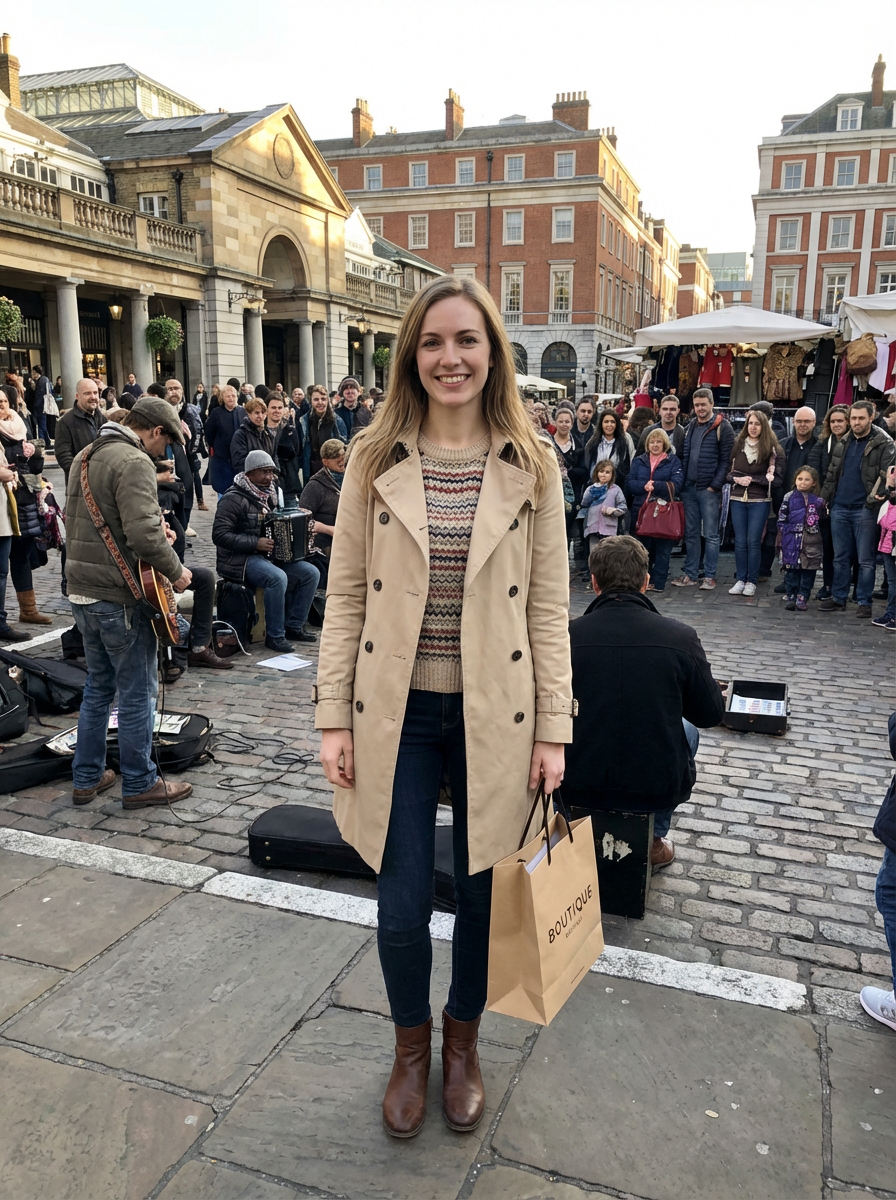 model in Covent Garden, street performer background, stylish shopping outfit, lively atmosphere