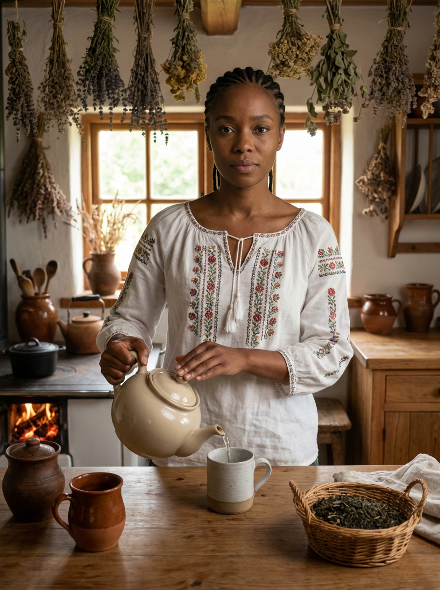 model in cozy cottage interior, embroidered blouse , making tea, dried herbs hanging