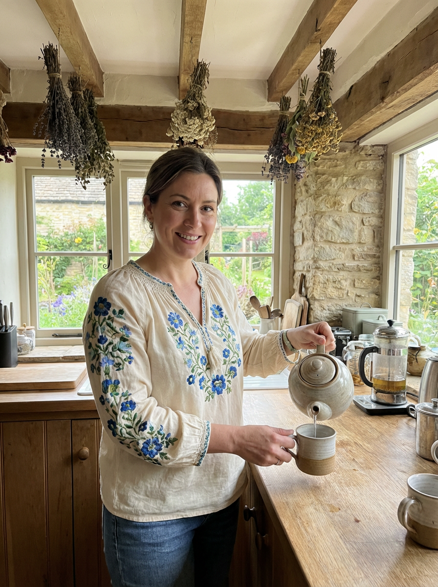 model in cozy cottage interior, embroidered blouse , making tea, dried herbs hanging