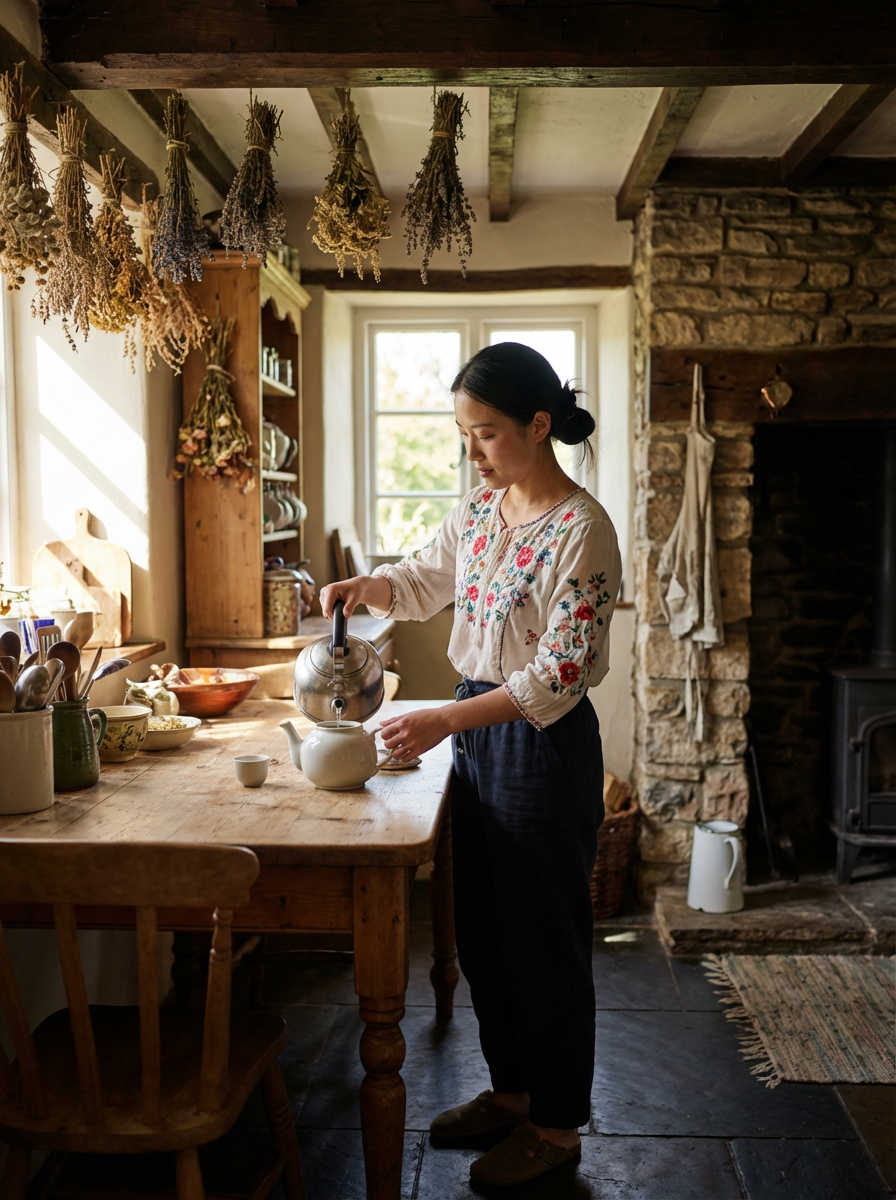 model in cozy cottage interior, embroidered blouse , making tea, dried herbs hanging