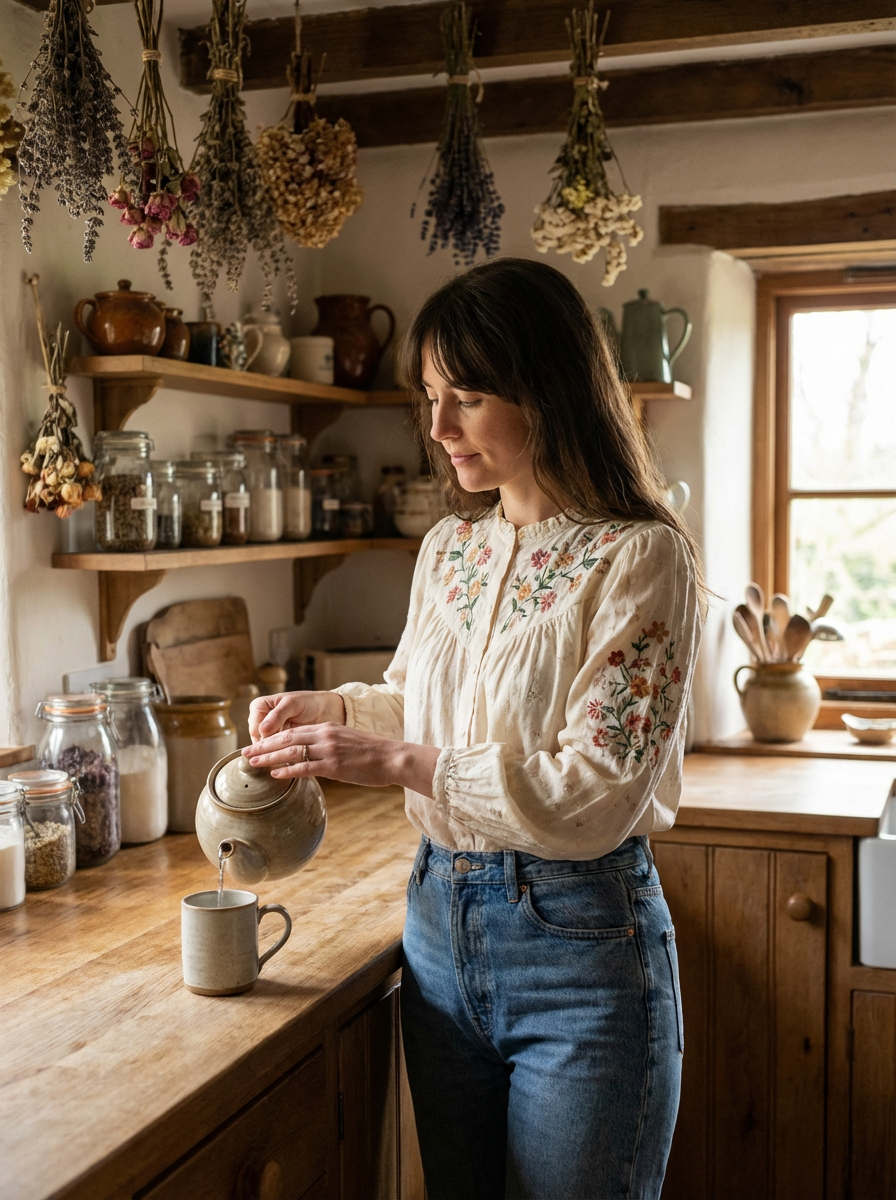 model in cozy cottage interior, embroidered blouse , making tea, dried herbs hanging