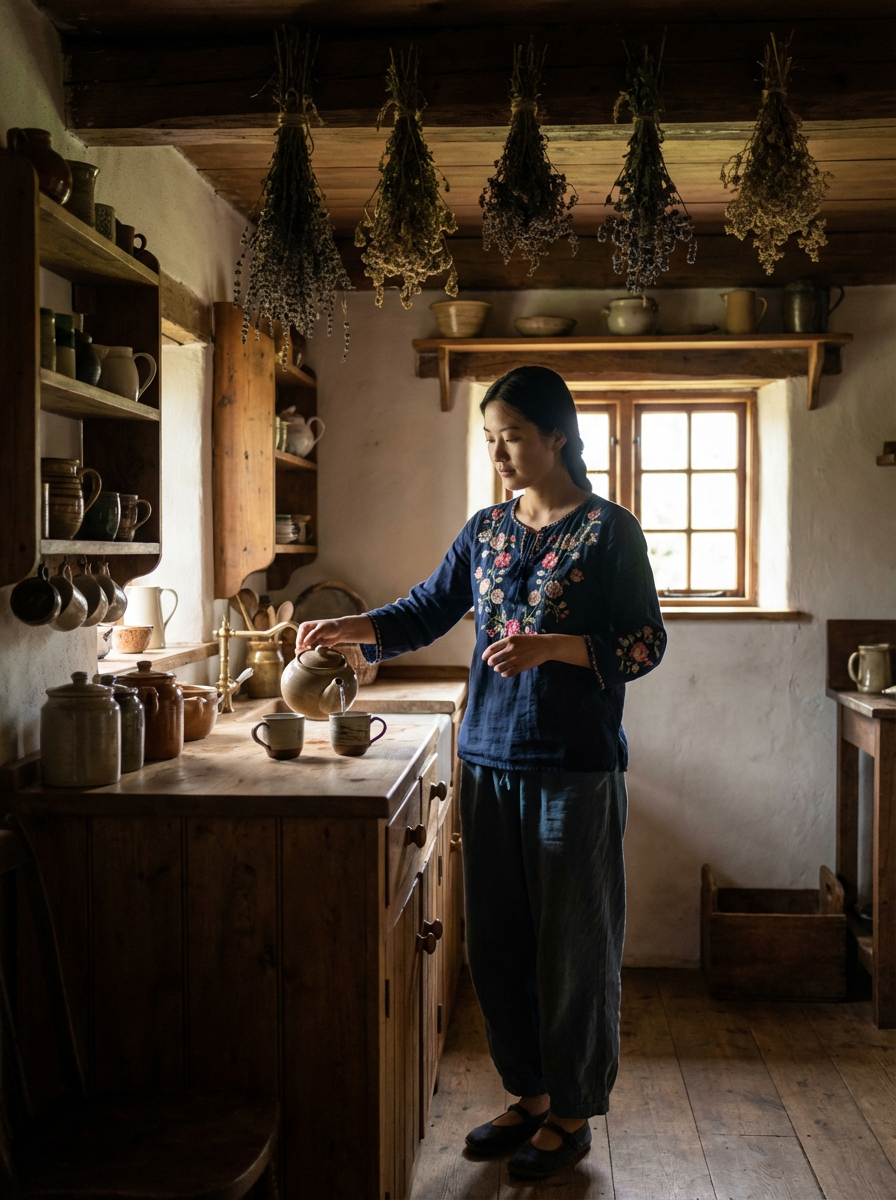 model in cozy cottage interior, embroidered blouse , making tea, dried herbs hanging