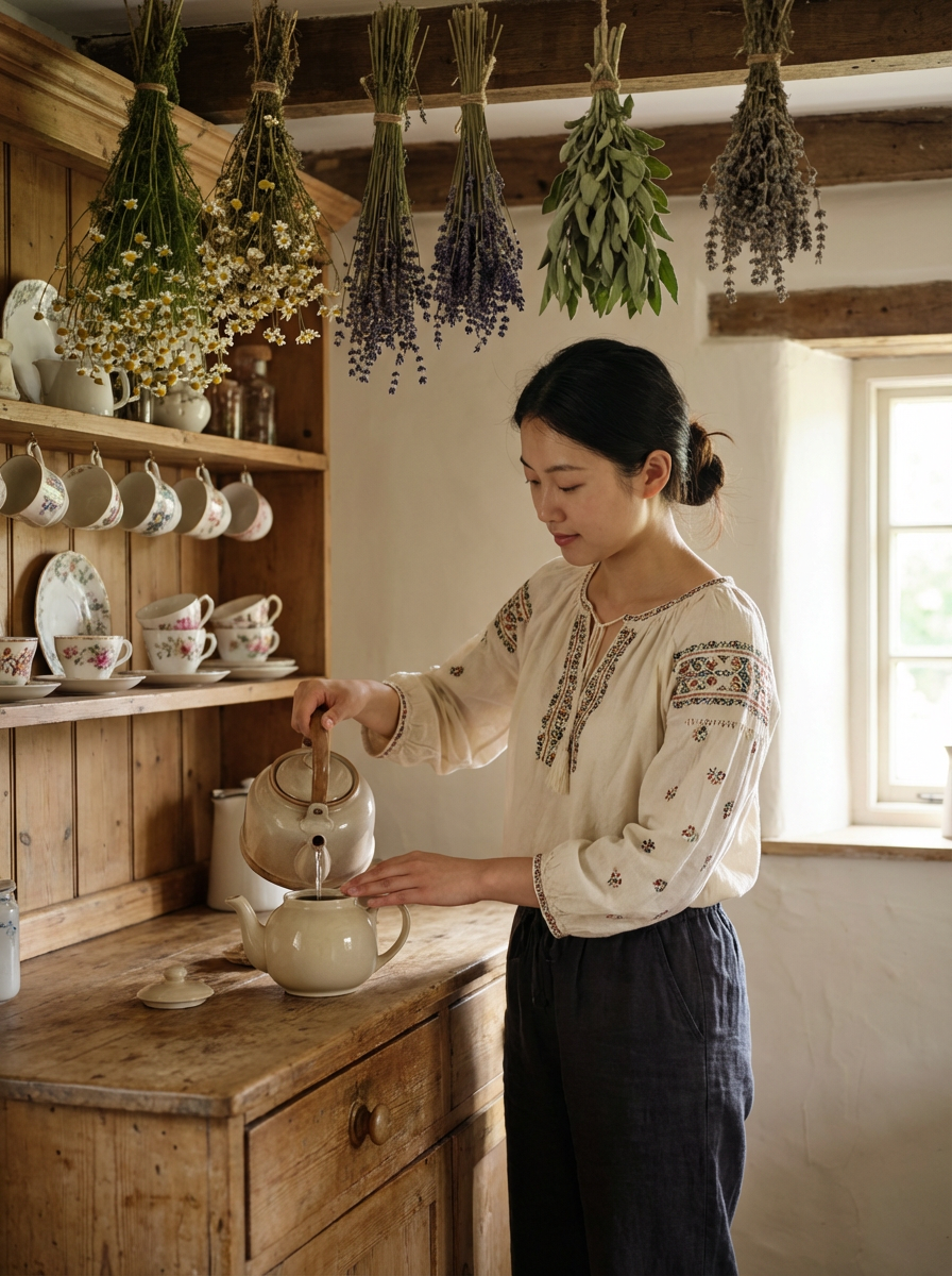 model in cozy cottage interior, embroidered blouse , making tea, dried herbs hanging