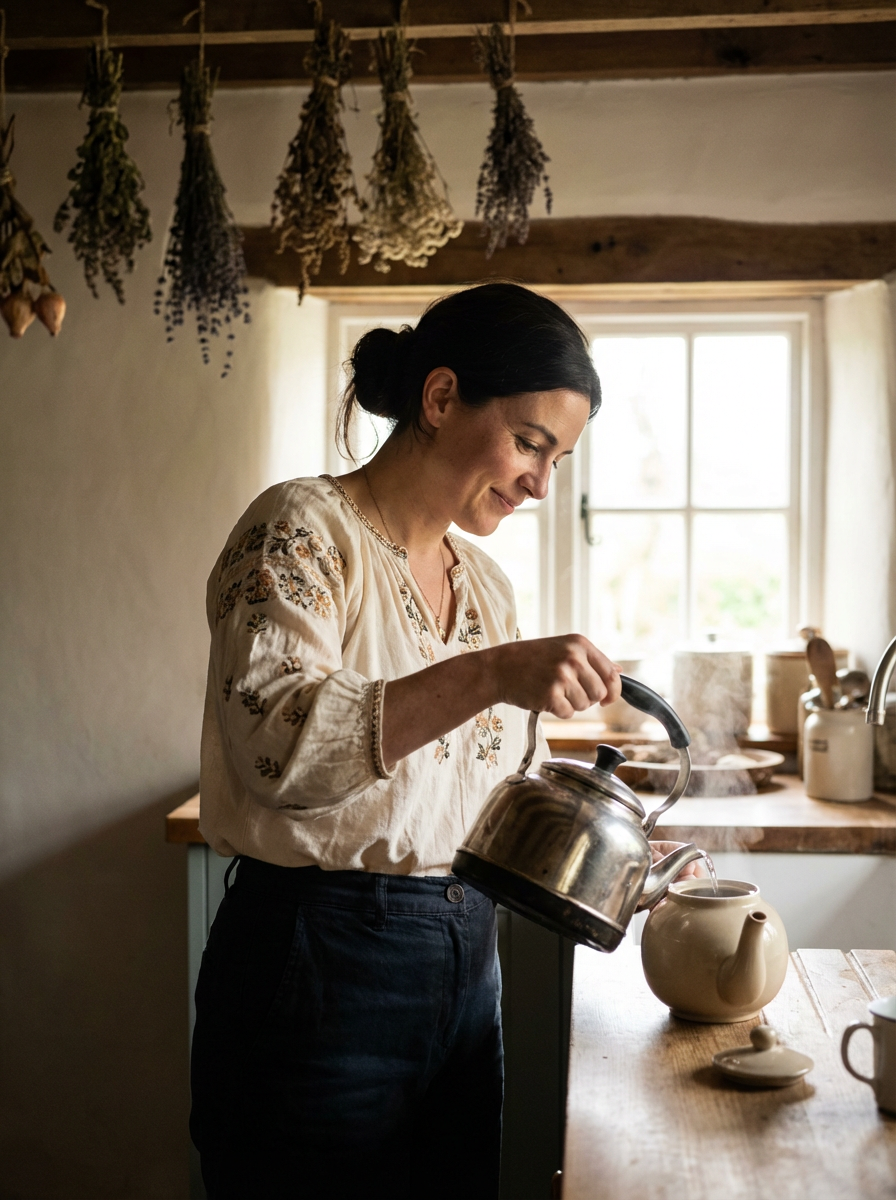 model in cozy cottage interior, embroidered blouse , making tea, dried herbs hanging