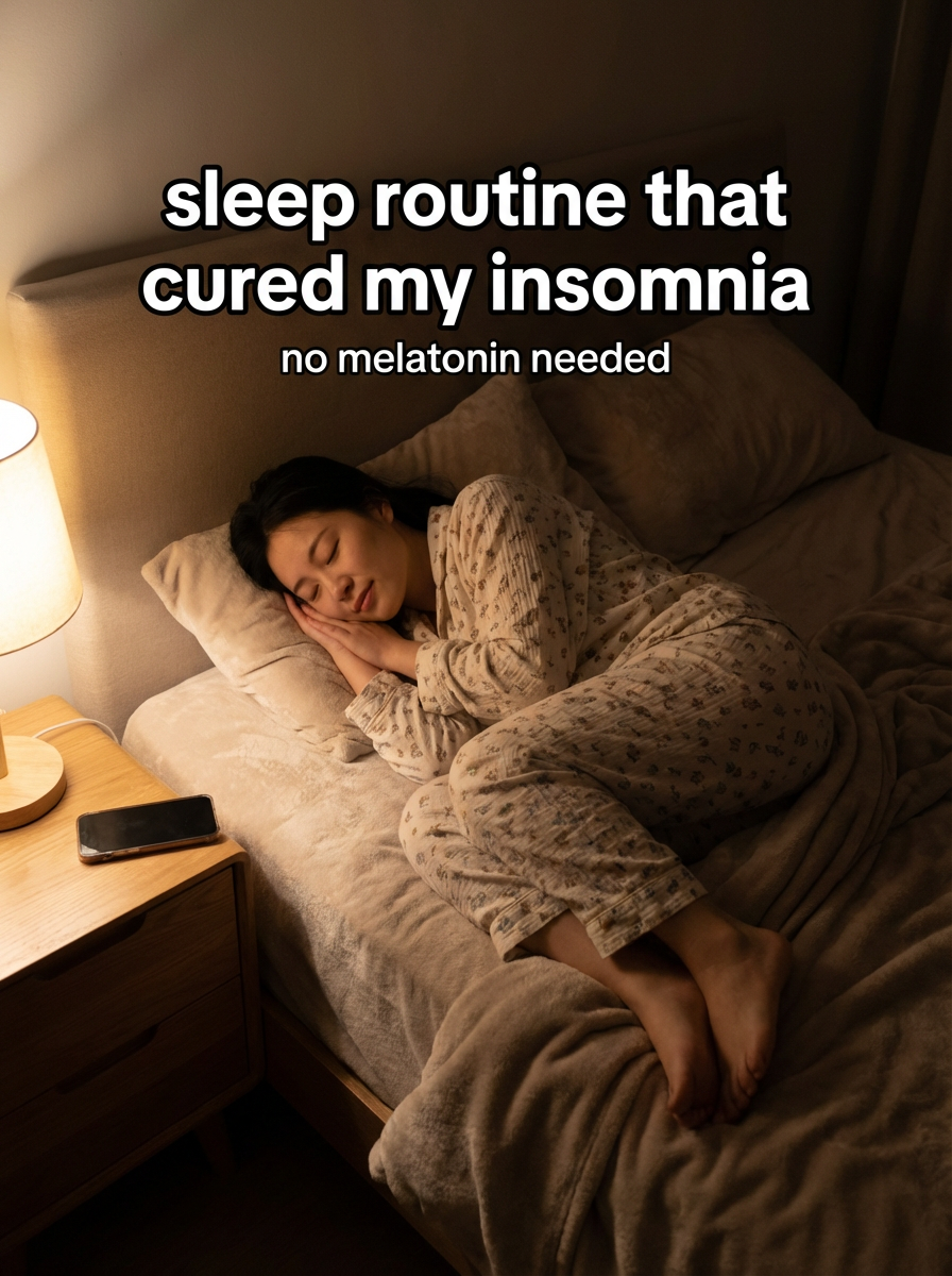 model in cozy pajamas in bedroom, phone on nightstand, peaceful expression, dim evening lighting. TikTok text overlay: "sleep routine that cured my insomnia" smaller text: "(no melatonin needed)" , do not show tiktok interface