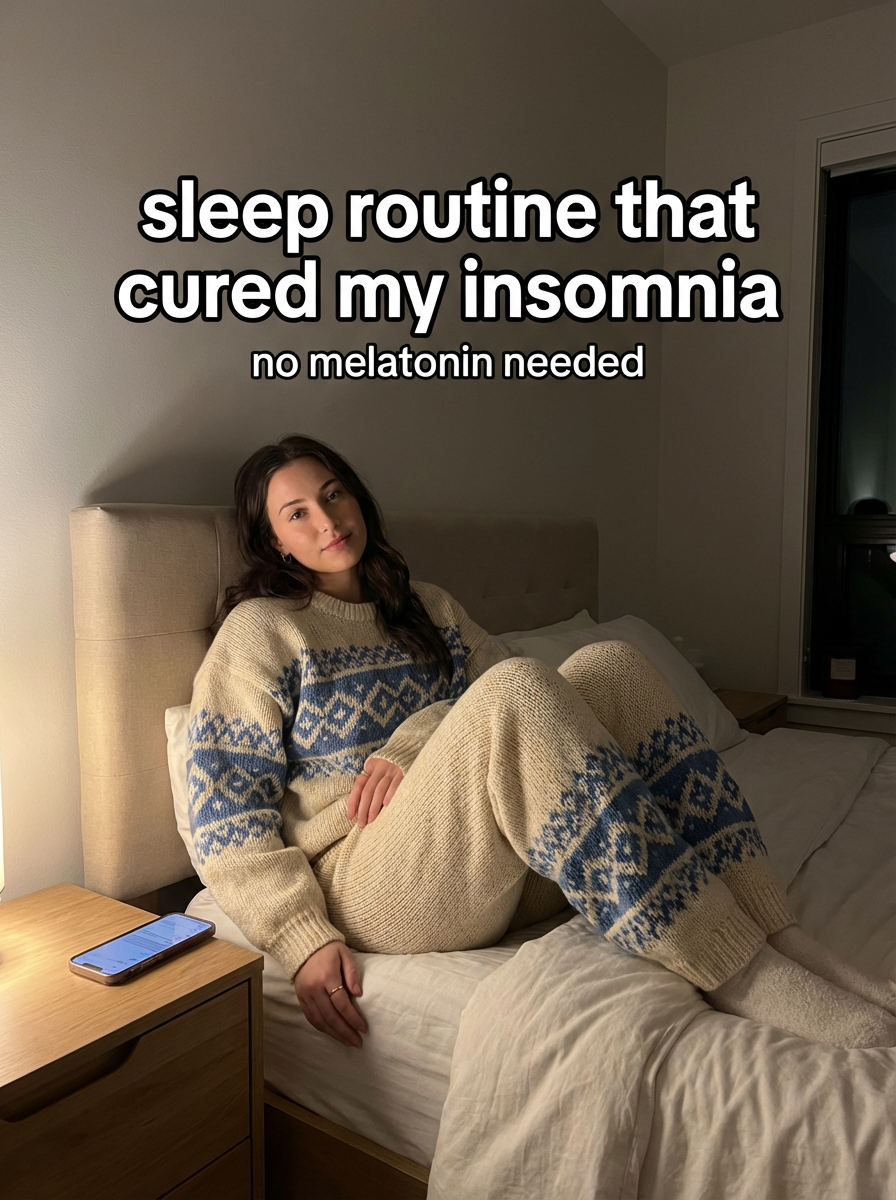 model in cozy pajamas in bedroom, phone on nightstand, peaceful expression, dim evening lighting. TikTok TikTok-style text overlay with white text with black outline: "sleep routine that cured my insomnia" smaller text: "(no melatonin needed)" , do not show tiktok interface or logo