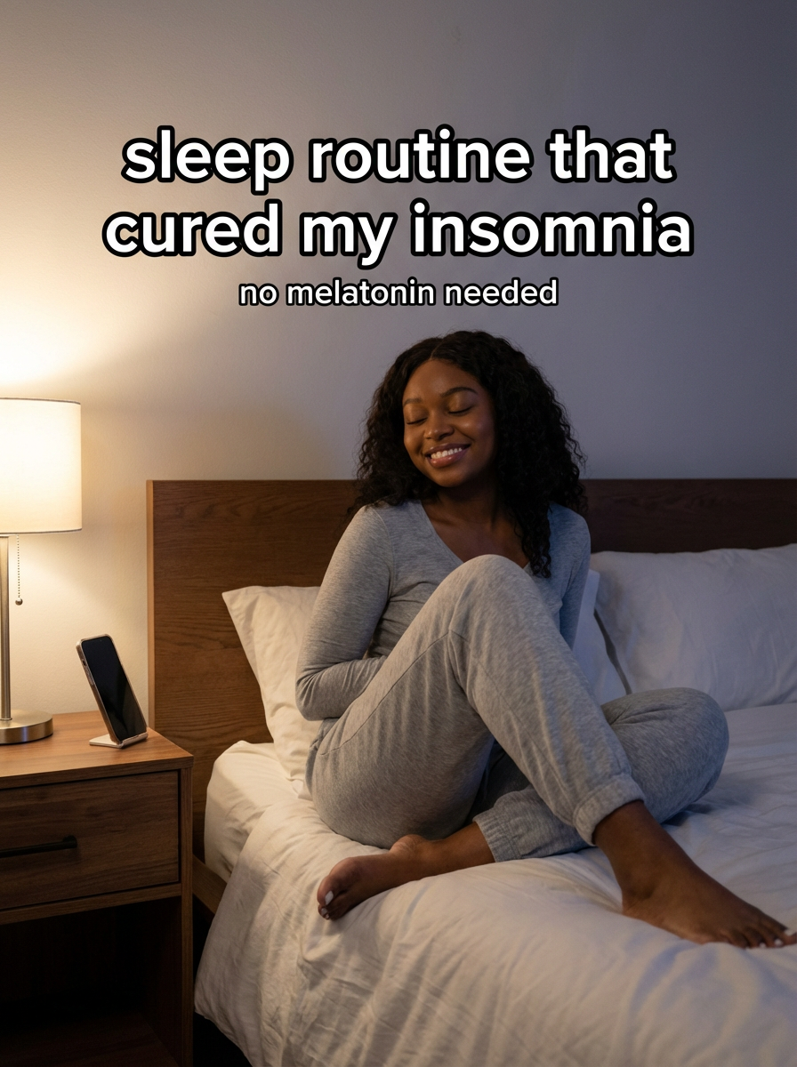 model in cozy pajamas in bedroom, phone on nightstand, peaceful expression, dim evening lighting. TikTok-style text overlay with white text with black outline: "sleep routine that cured my insomnia" smaller text: "(no melatonin needed)" , do not show tiktok interface or logo