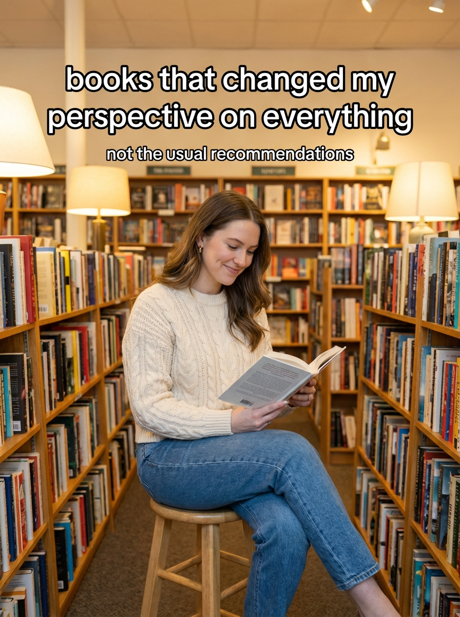 model in cozy sweater and jeans in bookstore or library, surrounded by books, reading, warm lighting. TikTok-style text overlay with white text with black outline: "books that changed my perspective on everything" smaller text: "(not the usual recommendations)" , do not show tiktok interface or logo