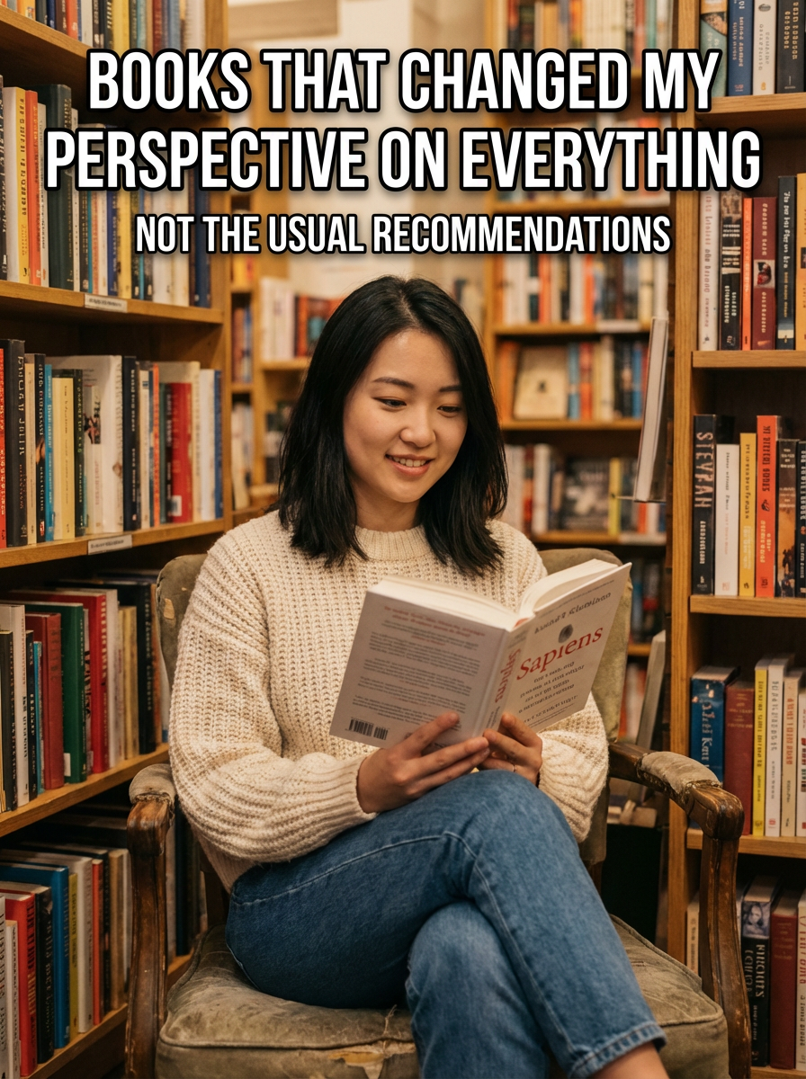 model in cozy sweater and jeans in bookstore or library, surrounded by books, reading, warm lighting. TikTok-style text overlay with white text with black outline: "books that changed my perspective on everything" smaller text: "(not the usual recommendations)" , do not show tiktok interface or logo