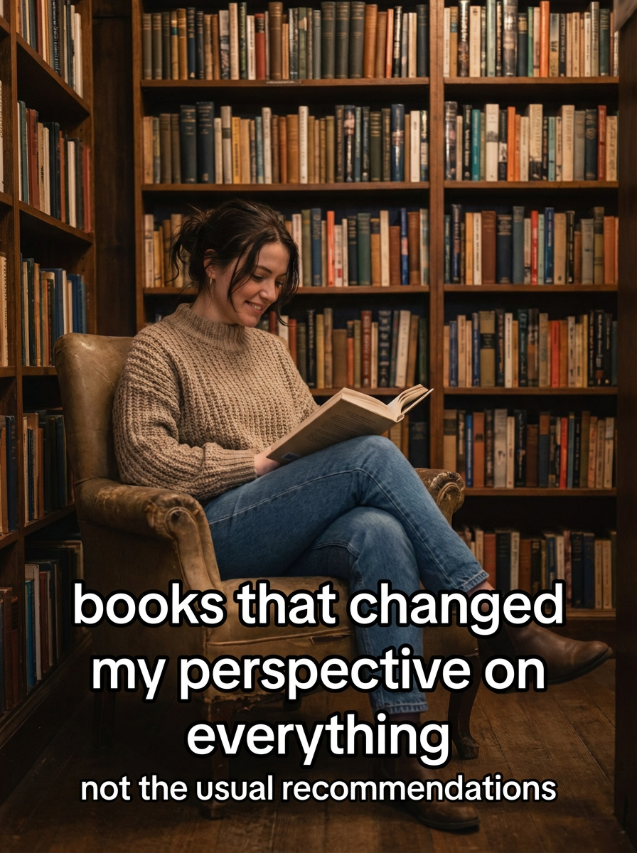 model in cozy sweater and jeans in bookstore or library, surrounded by books, reading, warm lighting. TikTok-style text overlay with white text with black outline: "books that changed my perspective on everything" smaller text: "(not the usual recommendations)" , do not show tiktok interface or logo