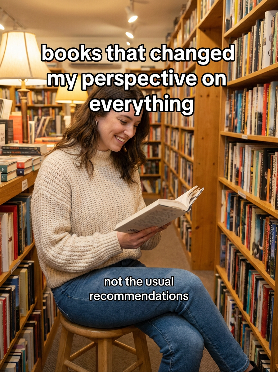 model in cozy sweater and jeans in bookstore or library, surrounded by books, reading, warm lighting. TikTok-style text overlay with white text with black outline: "books that changed my perspective on everything" smaller text: "(not the usual recommendations)" , do not show tiktok interface or logo