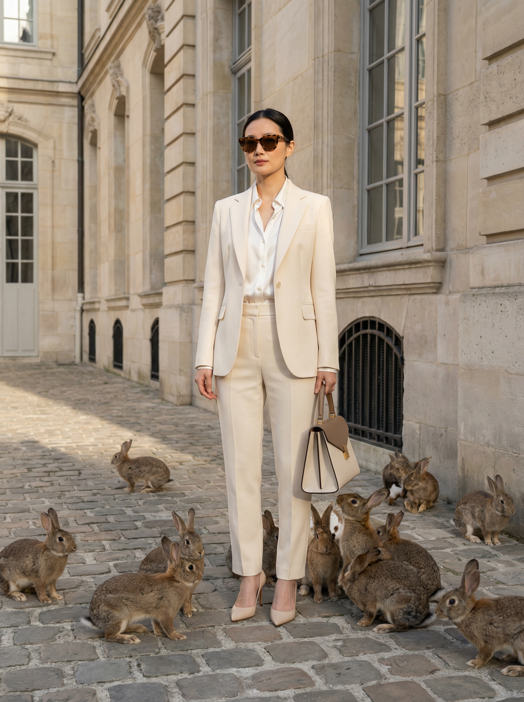 model in cream tailored suit, silky blouse, pointed heels, sunglasses, structured handbag in a quiet cobblestone courtyard beside an elegant building facade, 15 rabbits hopping around the model’s feet and gathering near the bag, calm composed pose, luxury editorial street style, soft morning light, ultra photorealistic